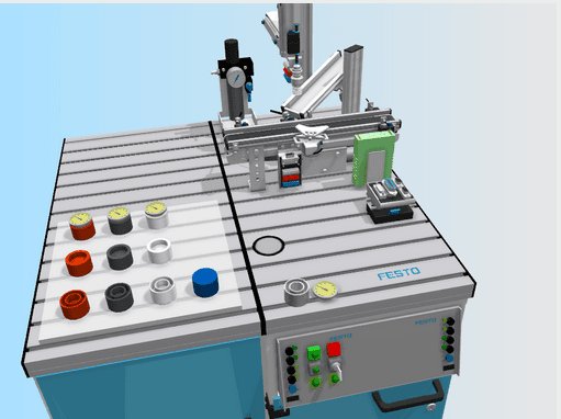 Ngoài những thứ khác, trạm MPS Pick&Place D bao gồm cơ sở và ứng dụng của công nghệ chân không trong một quy trình tự động. Bộ kẹp khí nén và mô-đun băng tải vận chuyển phôi.